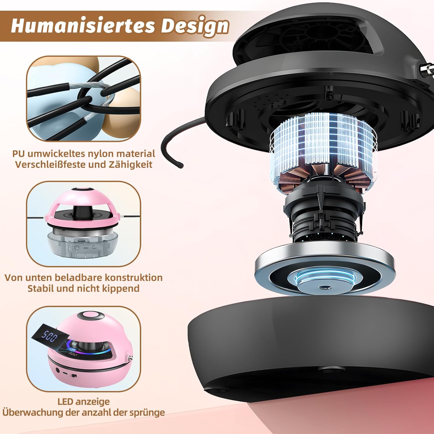 - 🏆️【Ideal Für Freizeit und Fitness】Diese kompakte und tragbare elektronische springseil maschine kombiniert intelligenz und unterhaltung und ist damit das perfekte gerät für indoor training, fitnessstudio workouts, familientreffen und mehr.Die elektrische rotierende workout skipping rope hat glatte kugellager im inneren, die eine ungehinderte, stabile 360°-drehung ermöglichen, ohne dass man sich sorgen machen muss, dass sich das seil verheddert. Ideal, um freunde und familie von der elektronik wegzubringen und gemeinsam zu trainieren!